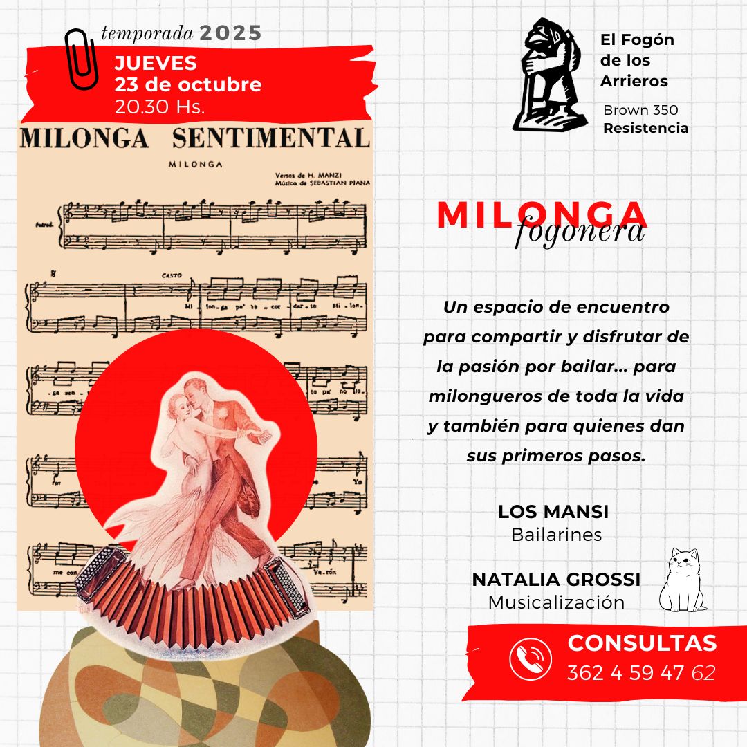 El próximo jueves 7 de octubre, a partir de las 21:30 horas, las casetas de tango de Resistencia y la región tienen cita. El clásico ciclo de tango de los jueves que lleva tantos años ejecutando El Fogón de los Arrieros -Brown 350- celebrará un nuevo encuentro. Como es habitual, los interesados ??pueden realizar sus reservas y consultas llamando al 4426418 o llamando al 362 4 59-4762.En esta ocasión, el maestro Aldo Verón decora la noche para acompañar a cantantes y bailarines con su bandoneón para mantener encendida la llama del 2x4 en el santuario tanguero. Asimismo, el consolidado Trigémino Trio (Muñoz Fernández - Giménez - Mosca) se suma a la velada para acompañar a quienes deseen mostrar su repertorio. Según los organizadores, la cita se prolongará hasta casi la medianoche. Como es tradición, Adriana -la legendaria joven bombero- garantiza una excelente atención a los concursantes. El Fogón de los Arrieros atiende la situación sanitaria actual.