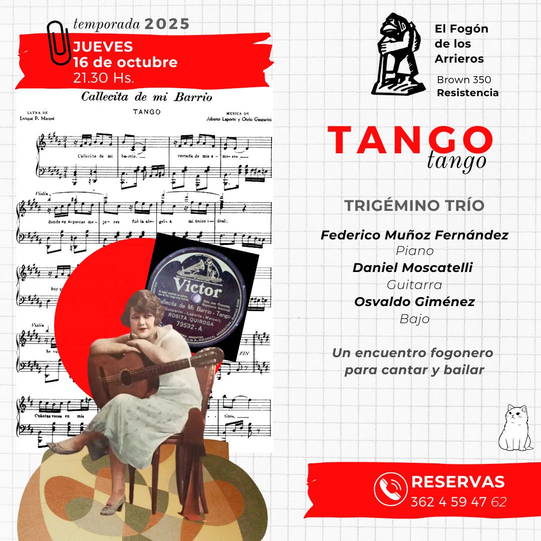 El jueves 9 de diciembre -a partir de las 21.30- El Fogón de los Arrieros -Brown 350- propone la tradicional noche de tango con el acompañamiento de Trigémino Trío que integran Giménez, Muñoz Fernández y Moscatelli. Los tangueros de Resistencia y la región tienen una cita en el clásico ciclo Jueves de tango que hace tantos años lleva adelante el santuario del 2x4. Las entradas generales tienen un costo de $300, mientras que los socios de la institución acceden gratuitamente. En esta ocasión se evocará especialmente el Día Nacional del Tango que se conmemora el 11 de diciembre. Como es habitual, los interesados pueden hacer sus reservas y consultas al teléfono 4426418 o al celular 362 4 59-4762.